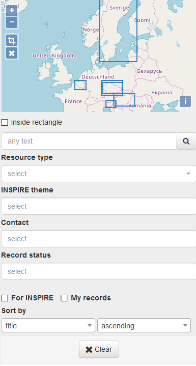 For authorized users the extended search form is displayed. The search criteria come from mandatory CSW queryables, INSPIRE and provider needs. The result is defined as intersection between all filled search form fields (logical AND). Multiple values in the fields are treated as union between the values (logical OR).